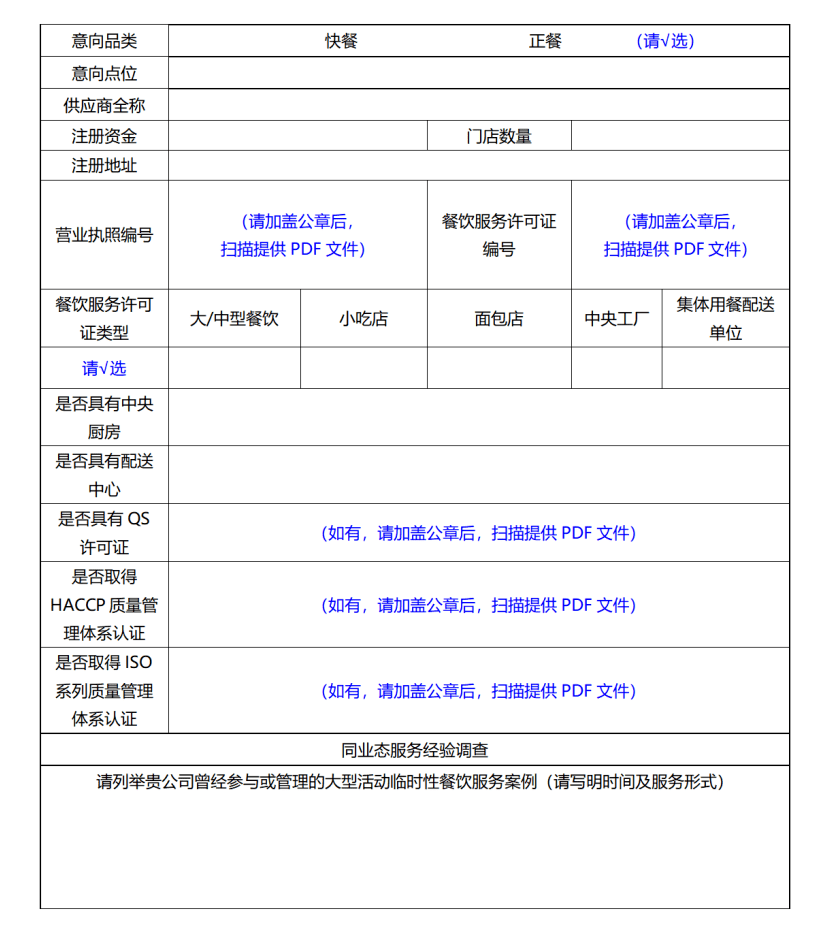 (一)报名资料:如您已满足以上中网公司对赛期餐饮服务商的要求,请您提供填写以下表格,并将相关材料发送至中网餐饮招商指定邮箱,以便让我们清晰的了解您的服务需求以及过往的运营经验,快速高效的推进下一步的洽商。