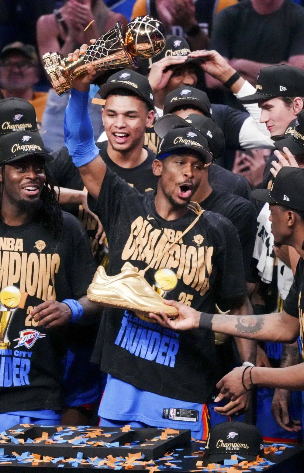 6月22日,俄克拉何马城雷霆队球员吉尔杰斯-亚历山大(前中)当选总决赛最有价值球员(FMVP)。新华社发(孙宇轩 摄)
