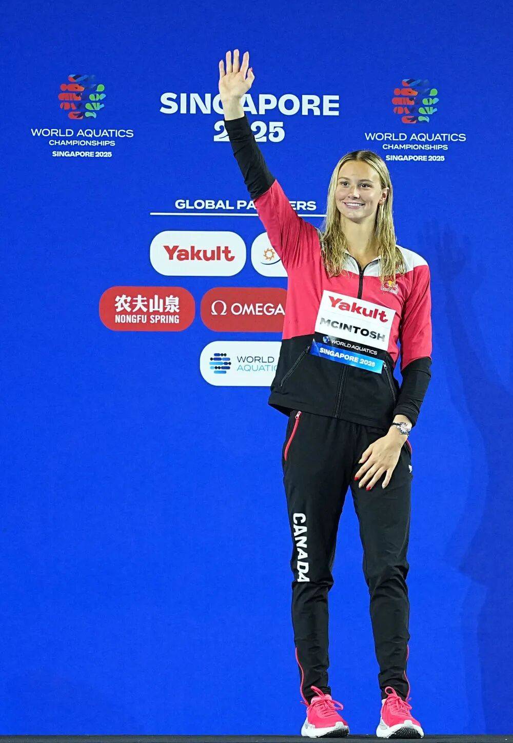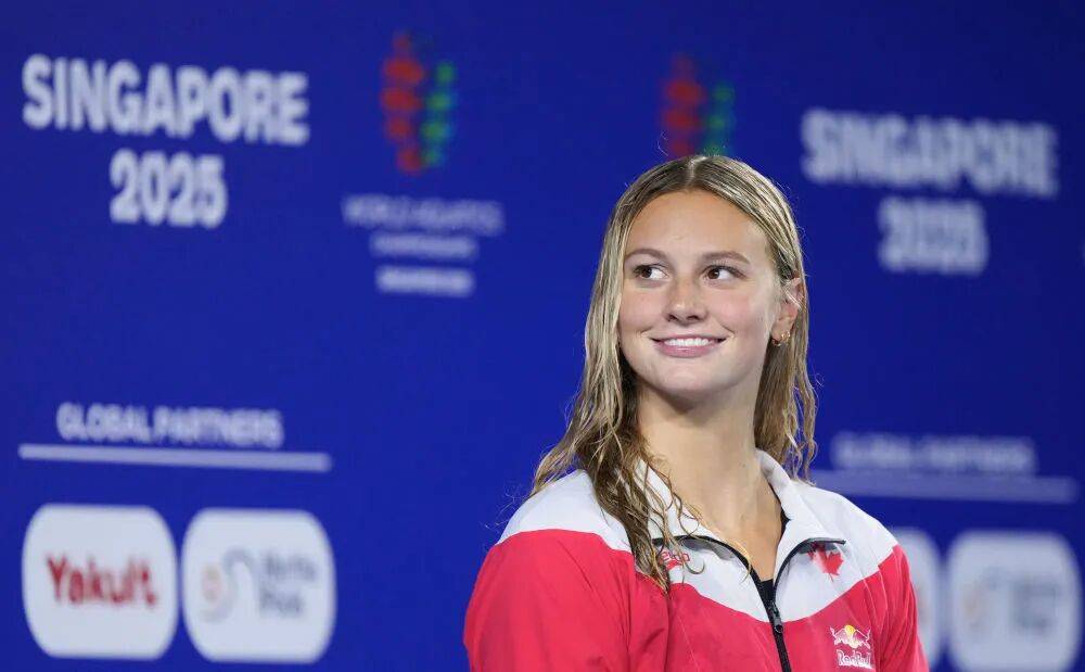 8月3日,2025年世界游泳锦标赛游泳女子400米个人混合泳决赛在新加坡进行。图为冠军加拿大选手麦金托什在颁奖仪式上。新华社记者 雒圆 摄
