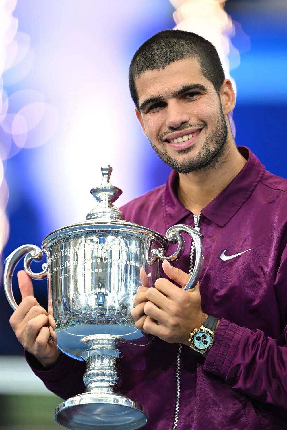 9月7日,冠军西班牙选手阿尔卡拉斯在2025美国网球公开赛男子单打颁奖仪式上。新华社记者 李睿 摄