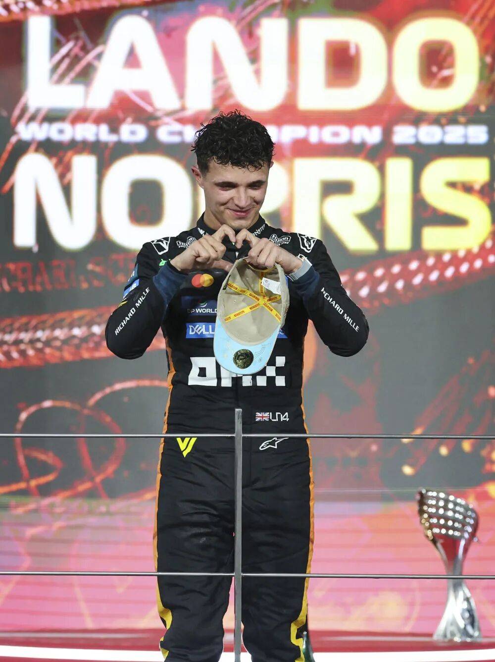 12月7日,迈凯伦车队英国车手诺里斯在职业生涯首次加冕F1车手总冠军后庆祝。新华社发(诸行健 摄)