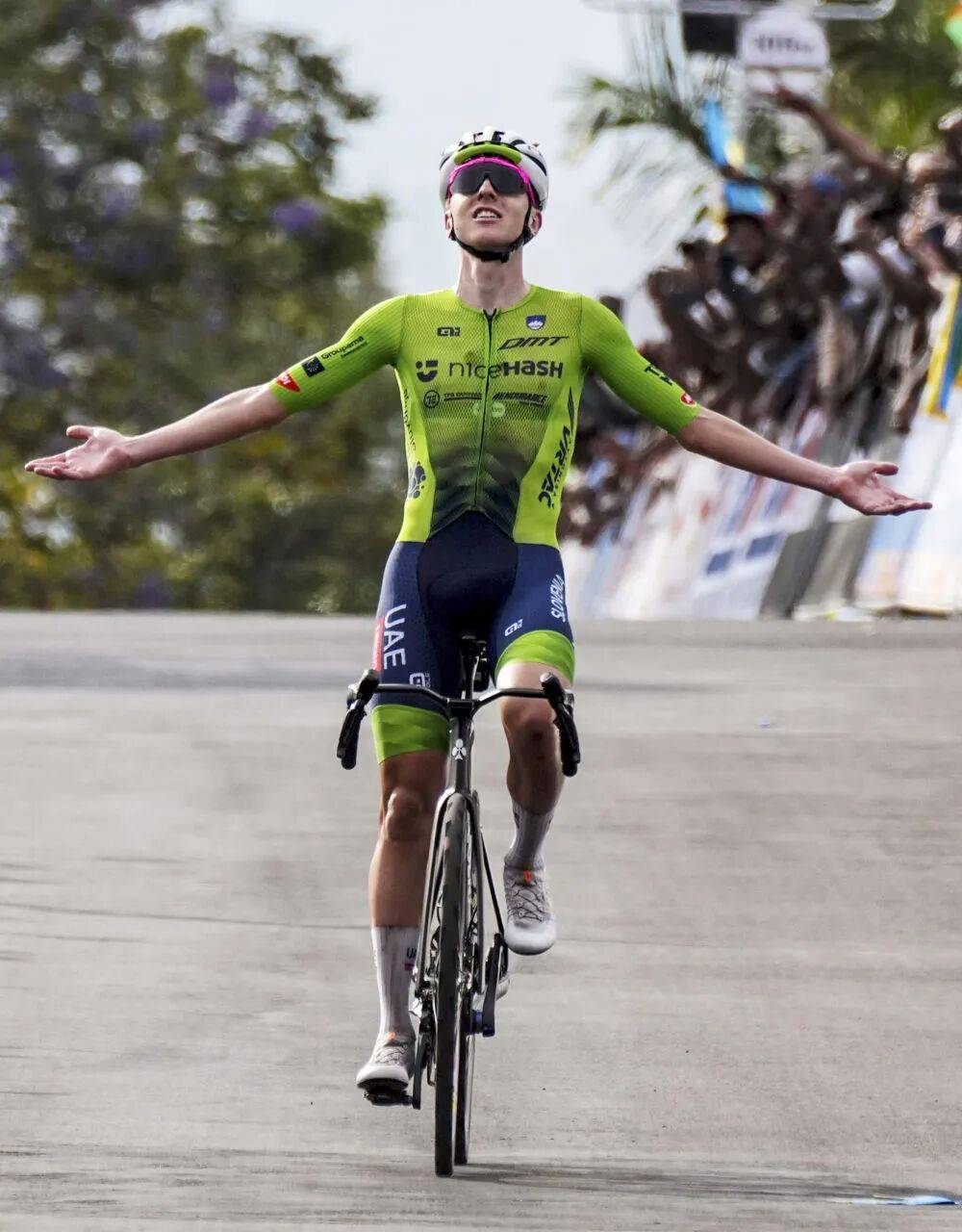 9月28日,斯洛文尼亚车手波加查在2025年公路自行车世锦赛中冲向终点。他夺得男子精英组冠军。新华社记者 李亚辉 摄