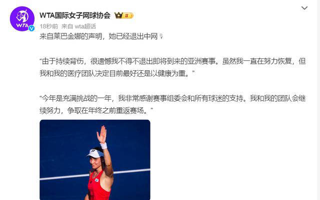 根据WTA国际女子网球协会的最新消息,哈萨克斯坦选手、前温网冠军莱巴金娜因持续的背伤,最终决定放弃参加此次中国网球公开赛。在她发布的声明中提到,她和医疗团队尝试了各种恢复方案,但为了健康和安全着想,最终做出了这个艰难的决定。