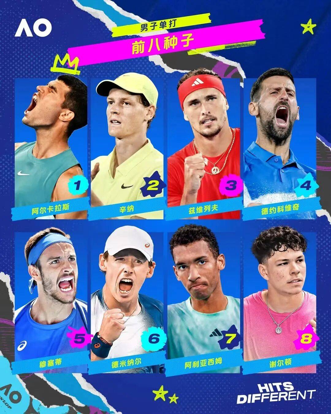 男单前八种子对位:阿尔卡拉斯 VS 德米纳尔、兹维列夫 VS 阿利亚西姆、穆塞蒂 VS 德约科维奇、谢尔顿 VS 辛纳