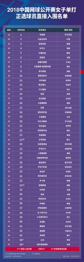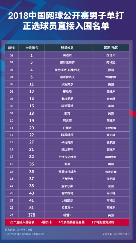 2018年中国网球公开赛单打正赛名单男子方面,Top10中穆雷、德尔-波特罗、兹维列夫、迪米特洛夫四位球员均已宣布参赛,倍受中国球迷喜爱的沃达斯科、伊斯内尔也位列其中。成功杀入过大满贯四强的95年出生的埃德蒙德,还有丘里奇、卡恰诺夫、卢布列夫等新生代球员,都是巡回赛中不可小觑的力量,可谓看点十足。而世界第一纳达尔宣布因伤退出2018中国网球公开赛。